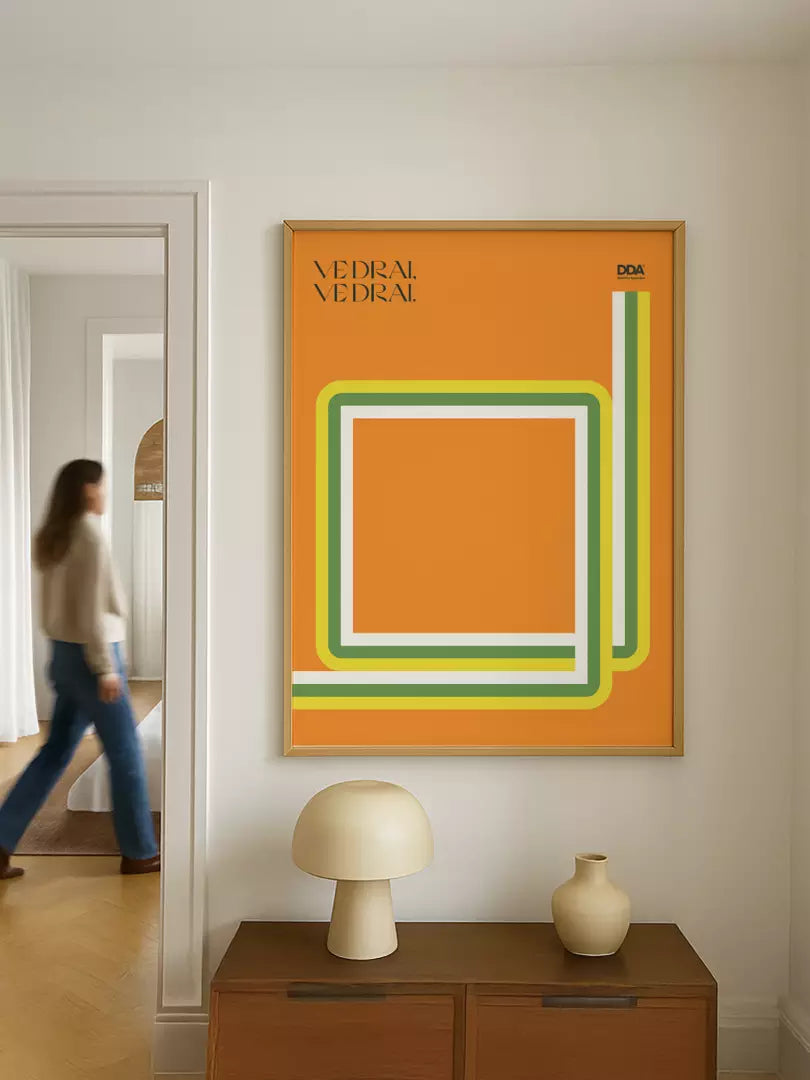 Un poster che porta con sé tutta la malinconia e la bellezza di uno dei capolavori di Luigi Tenco. “Vedrai, vedrai” è una canzone che ha segnato un’epoca, con parole semplici e cariche di emozione che parlano di speranza e fragilità umana. Il design richiama l’iconico arancione dei vecchi vinili, quando le copertine personalizzate non erano ancora la norma: un segno grafico essenziale e ripetuto che oggi diventa simbolo di autenticità e memoria. Un Disco da Appendere che trasforma le pareti in un frammento di storia e poesia.