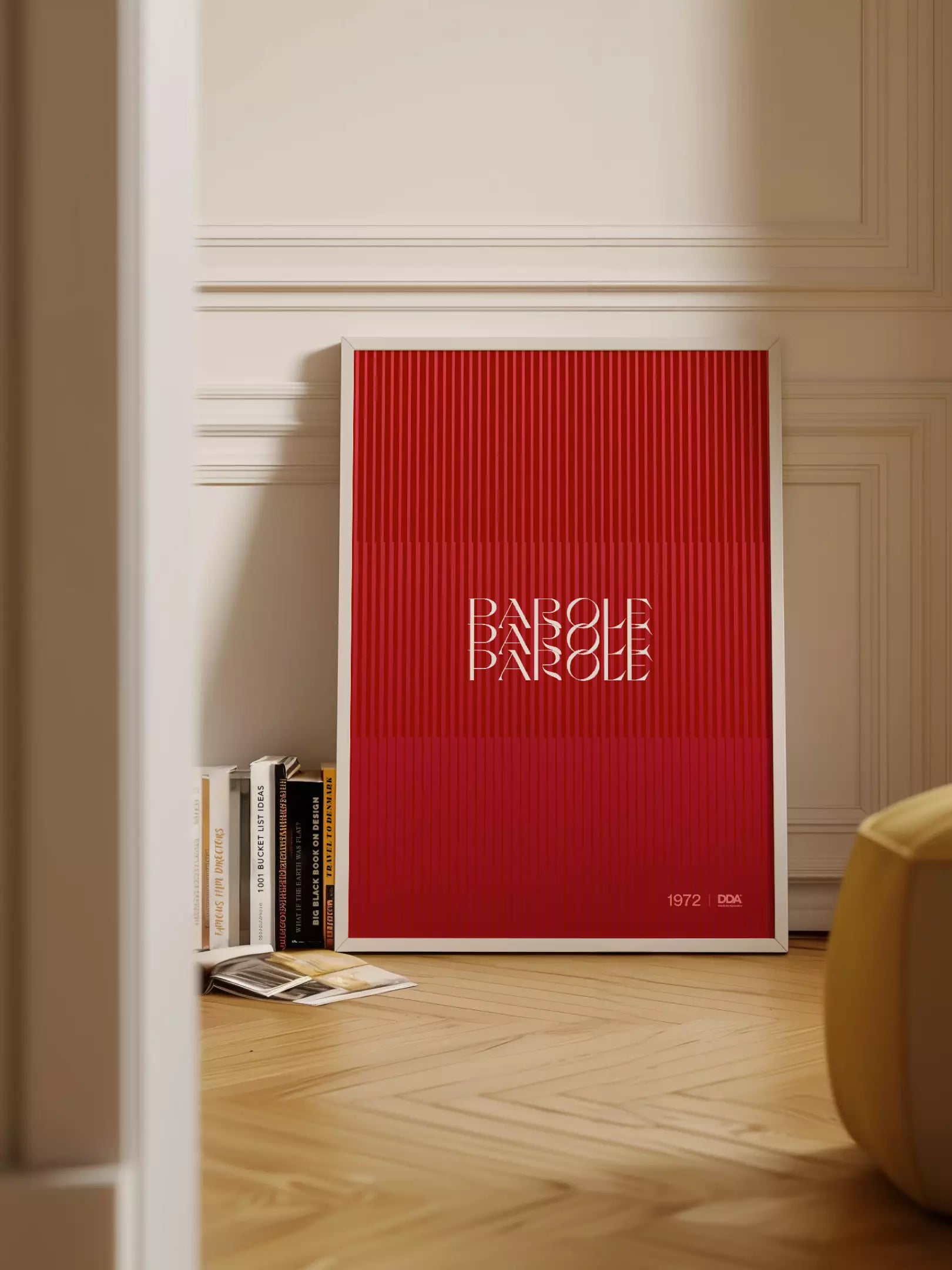 Questo poster reinterpreta visivamente il messaggio centrale di una delle canzoni più celebri degli anni '70, dove le parole si moltiplicano e si sovrappongono, perdendo progressivamente il loro significato. Il design, caratterizzato da linee sottili e ripetitive su uno sfondo rosso intenso, richiama il gioco di seduzione e disillusione al centro del brano.