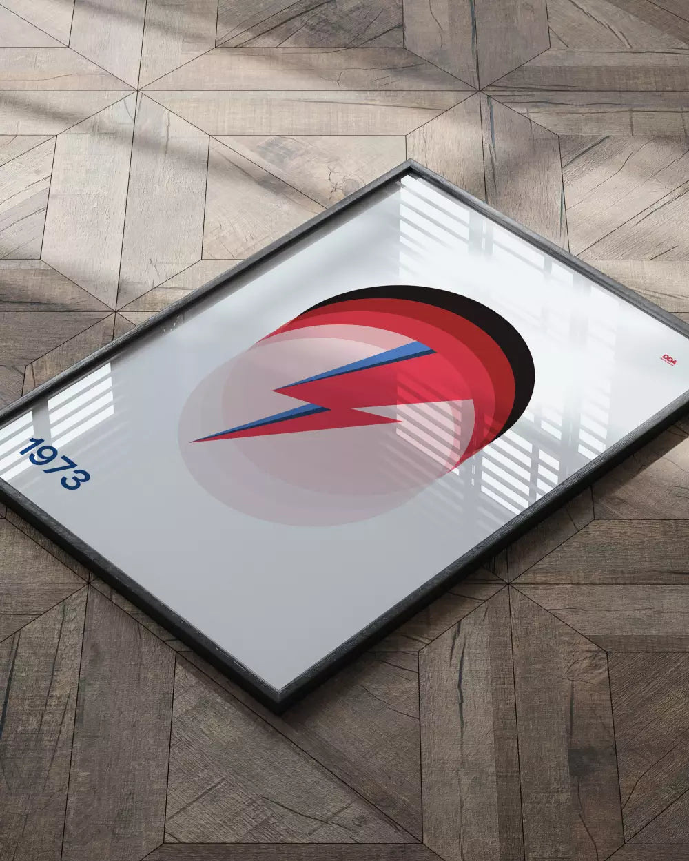 Il design del poster richiama il celebre volto dell'artista, con il fulmine distintivo che attraversa il suo viso, e una palette di colori vividi che evocano l'estetica psichedelica e teatrale dell'album. Perfetto per portare un tocco di originalità e impatto visivo in qualsiasi spazio, questo poster celebra l'energia e la creatività senza compromessi.